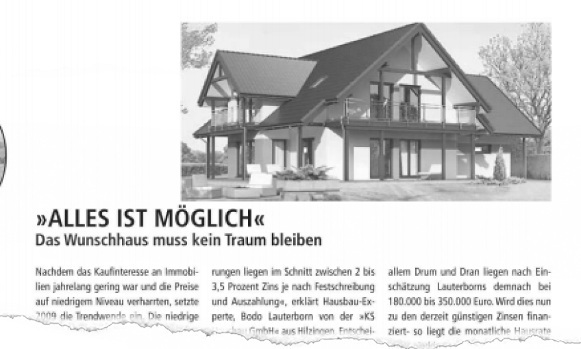 Die Kosten für ein Wunschhaus mit allem Drum und Dran liegen nach Einschätzung Lauterborns demnach bei 180.000 bis 350.000 Euro. Wird dies nun zu den derzeit günstigen Zinsen finanziert-so liegt die monatliche Hausrate meist niedriger als die aktuelle Mietzahlung. Somit ist und bleibt das eigene Haus immer noch die beste und sicherste Kapitalanlage.
