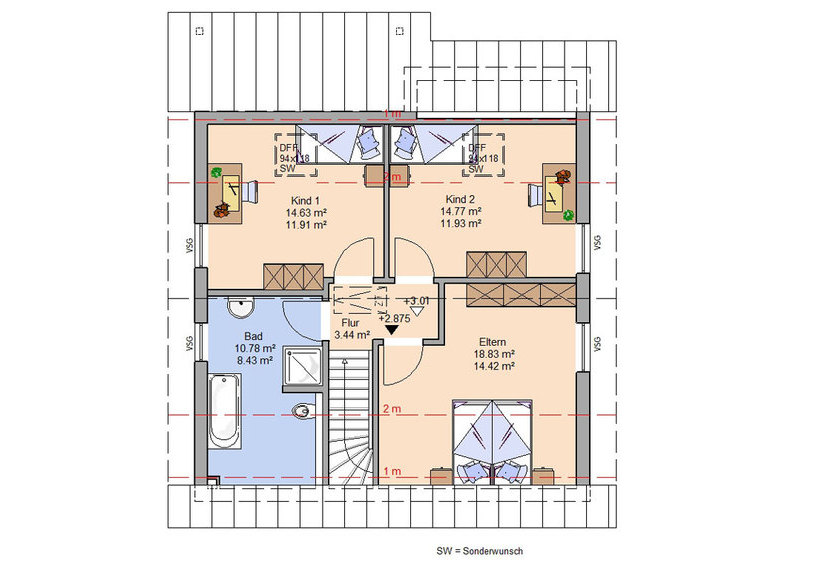 Family überzeugt mit seiner klassischen und klaren Architektur. Bodentiefe Fenster lassen viel Licht in die wohnlichen Innenräume. Der großzügige Wohn-/Essbereich mit offener Küche besitzt einen Sonnen-Erker und einen direkten Zugang zur praktischen, überdachten Terrasse. Das ideale Haus für die Familie bietet im Dachgeschoss neben einem (Eltern-)Schlaf- und einem Badezimmer genügend Platz für zwei weitere, gleichgroße Kinderzimmer.