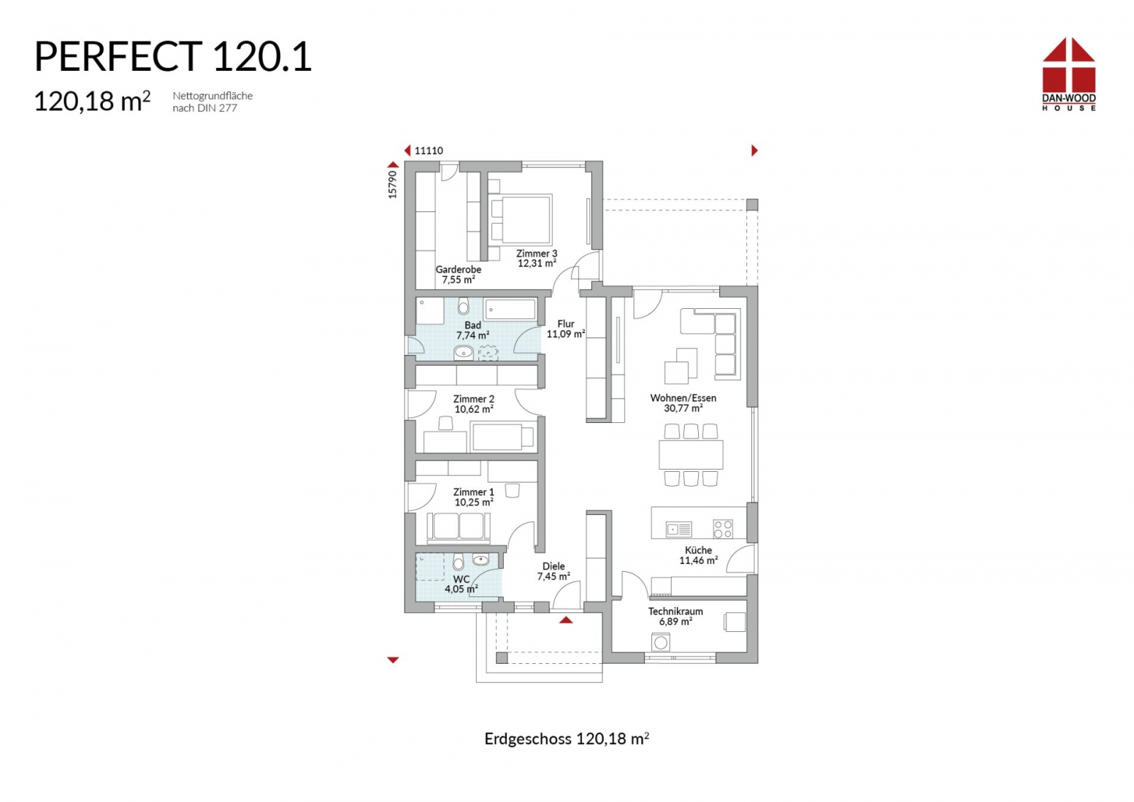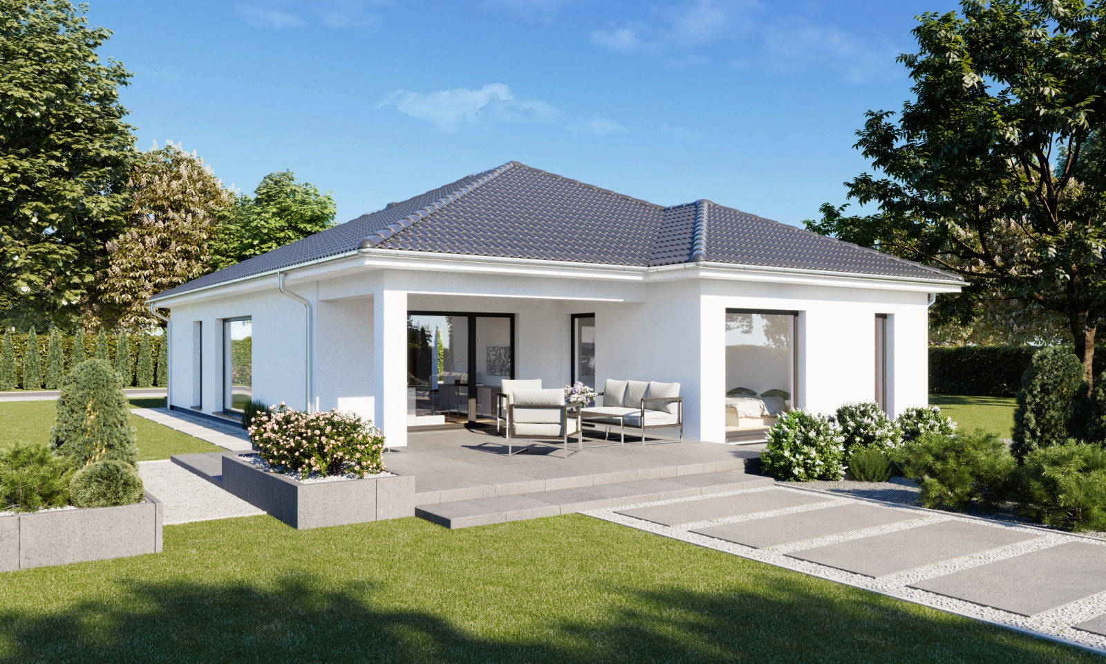 Winkelbungalow mit vier Zimmern, Ankleide, offener Küche, Bad, Gäste-WC (Duschbad möglich), Technikraum, Flur und Diele. Walmdach mit 25° Dachneigung inkl. Haustür-und Terrassenüberdachung.
