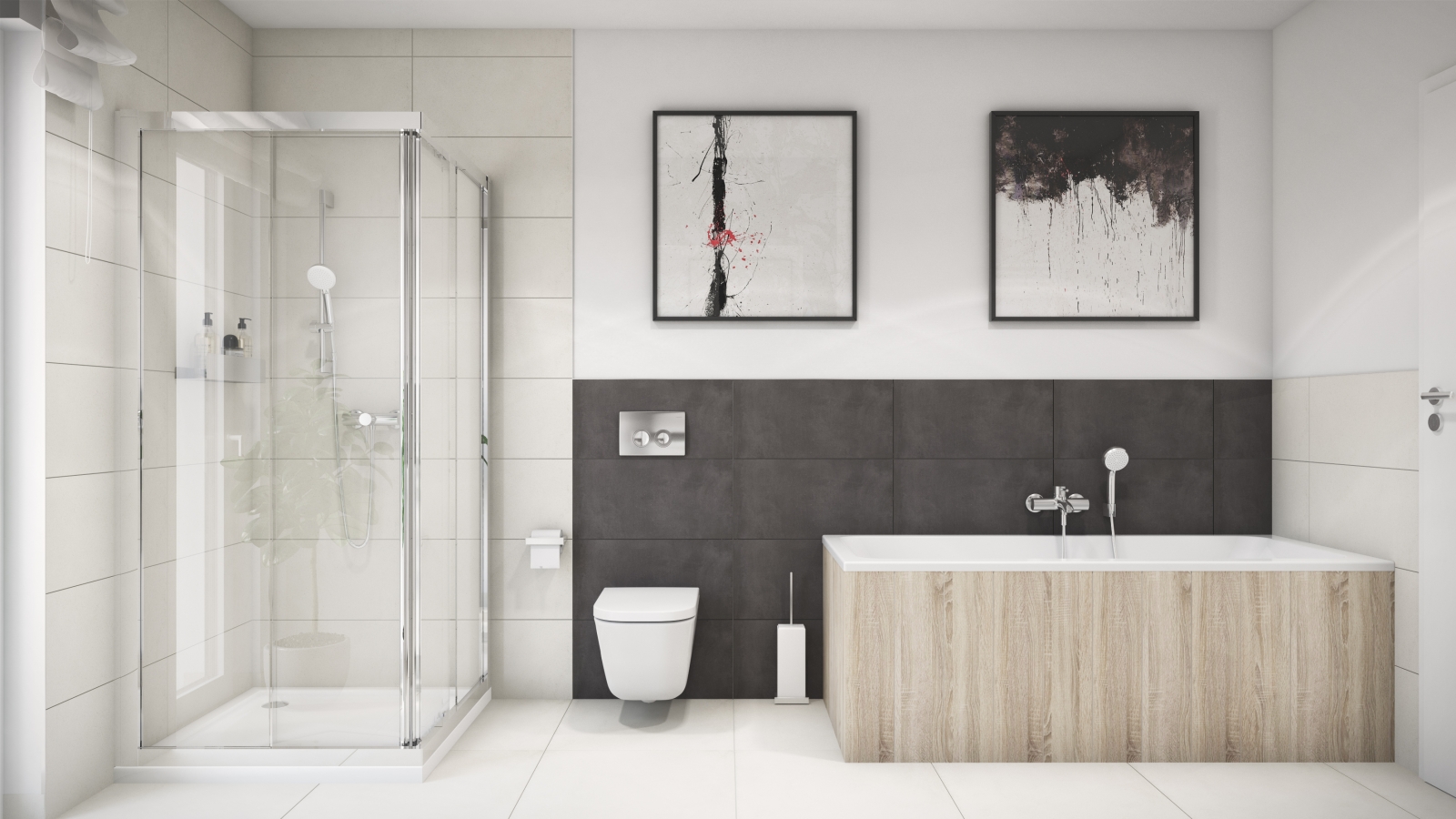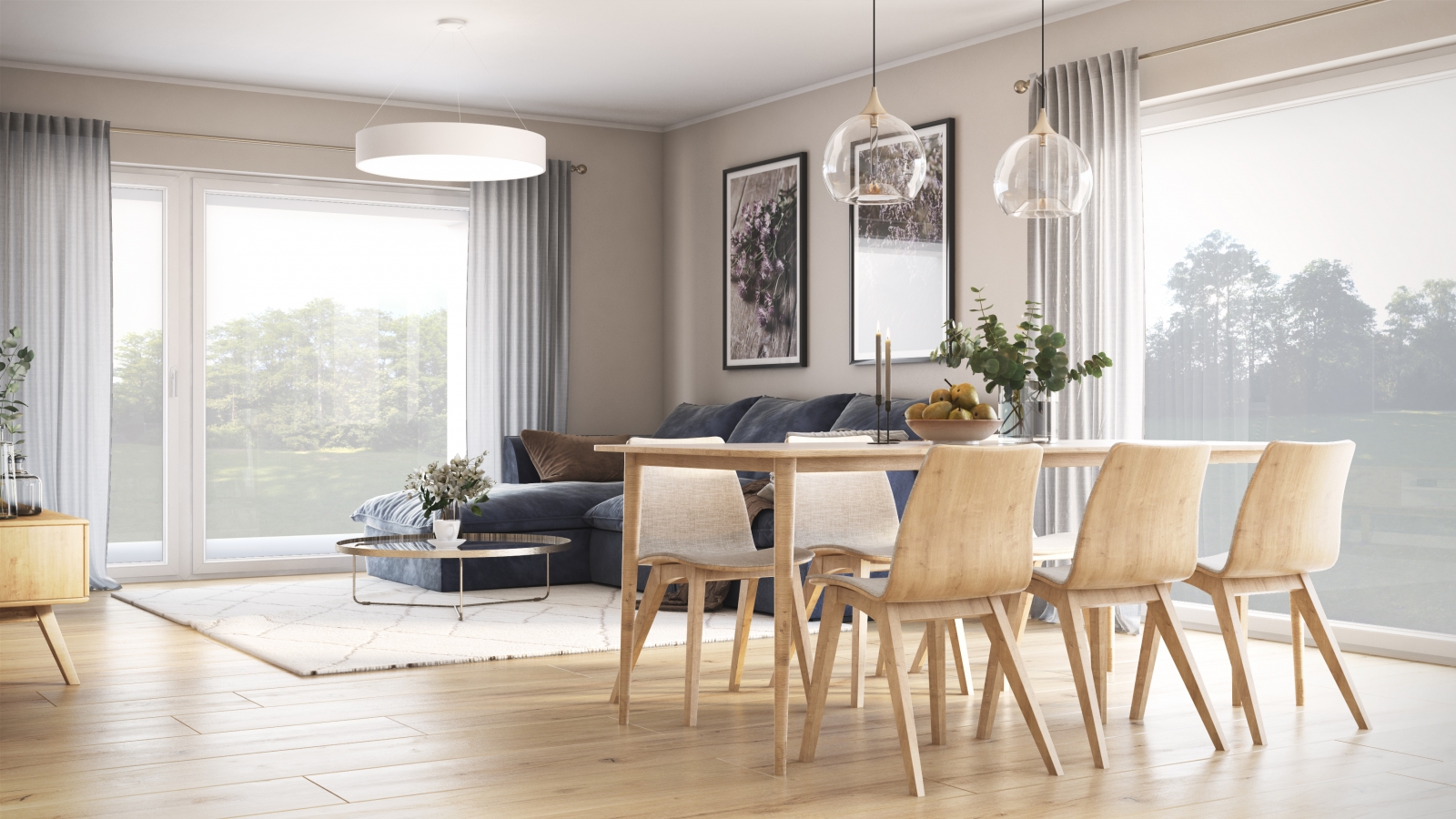 inklusive Maler, Fliesen, Sanitär, Vinyl, Laminat, elektrischen Rollläden und Technikpaket (Luft-Wasser-Wärmepumpe + Fußbodenheizung + zentrale Lüftungsanlage mit Wärmerückgewinnung) ab Oberkante Bodenplatte
